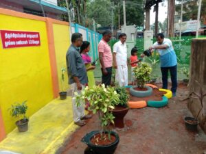 To promote the principles of recycling and reuse, the project creatively incorporates discarded materials. Items like ceramic toilet closets and broken pots have been repurposed into planters for ornamental plants, while old tires are being used as reusable flower pots. Depending on the available space, some areas have been developed into mini-gardens and fenced for protection.